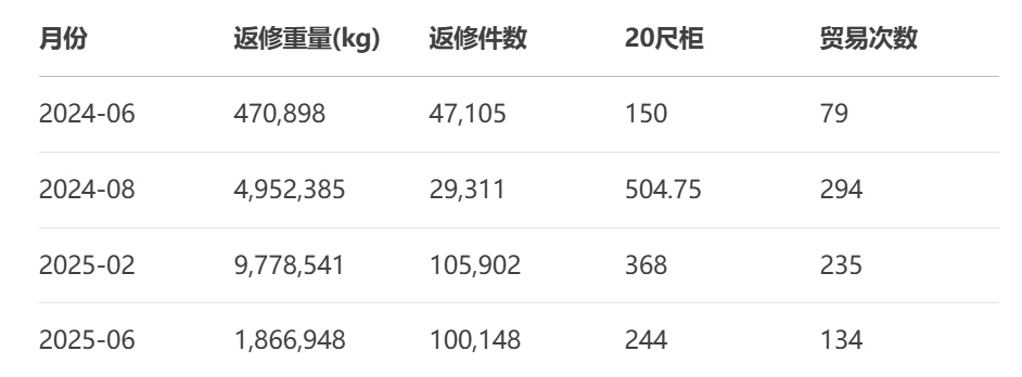 数据显示第三季度为返修高峰,与设备使用周期高度相关。 3. 物流成本优化明显 通过对比两个典型月份: 反映中国企业提升了返修效率和物流管理水平。