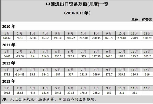 中国国家外汇管理局12月18日将中国第三季度常常项目顺差向上修改至404亿美元,开端数据为397亿美元。中国第二季度常常项目顺差为286亿美元。国家外汇管理局在公告中称,第三季度本钱和金融项目顺差也被修改至805亿美元,高于开端数据573亿美元。外管局还标明,中国第三季度外汇储备增加976亿美元,与开端数据一起。 海关数据查询总署上周末发布的数据闪现11月份出口额同比增速意外加快至12.7%,而进口额同比增速意外放缓至5.3%,11月贸易顺差高达331亿美元,创自2009年以来的最高水平。分析人士担忧,人民币兑美元持续增值以及债券收益率持续攀升可以再次诱使热钱通过虚报出口额流入中国。 以下为中国经济网集合拾掇的2010年1月份以来中国进出口贸易差额月度数据一览,仅供参考: